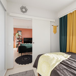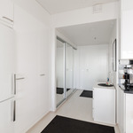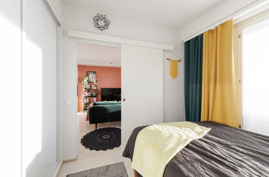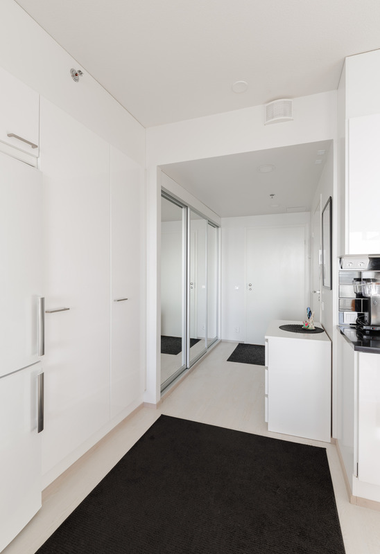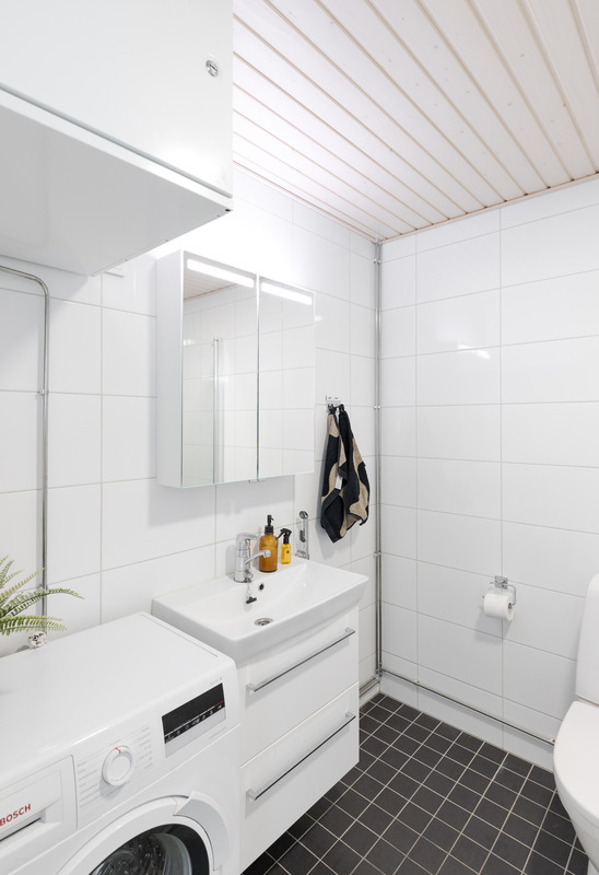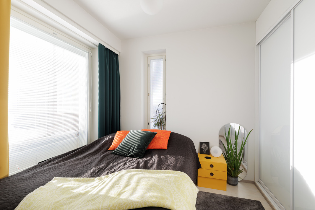 Makuuhuone sijaitsee talon kulmassa ja siellä on ikkuna myös ilta-auringon suuntaan. Makuuhuoneessa on koko seinän mittaiset liukuovikaapistot. Kaiken kaikkiaan huoneistossa on hyvä määrä kaappeja. Vaaleassa ja tilavassa kylpyhuoneessa on ilo myös hoitaa kodin pyykkihommat. Omaa saunaa ei tarvitse, sillä 14. kerroksessa on upea taloyhtiön saunaosasto.