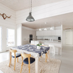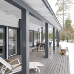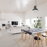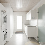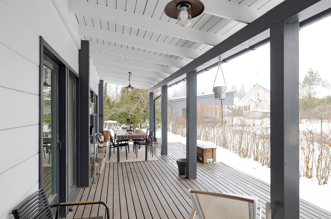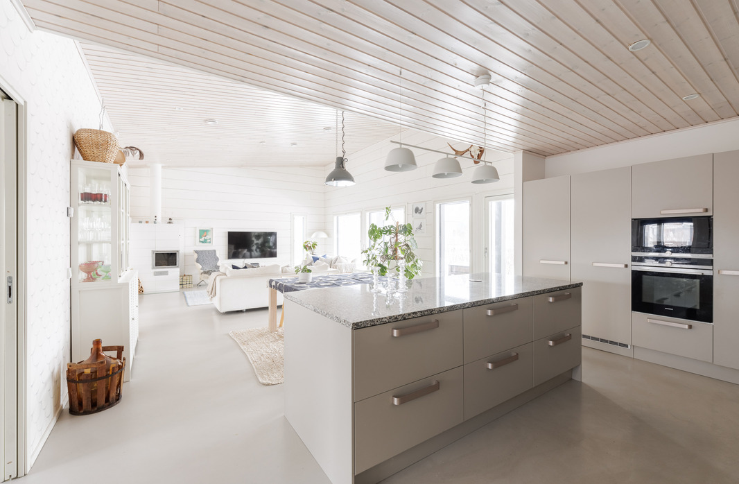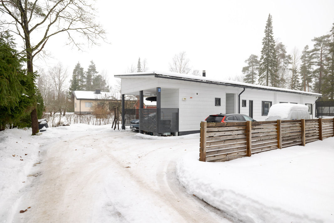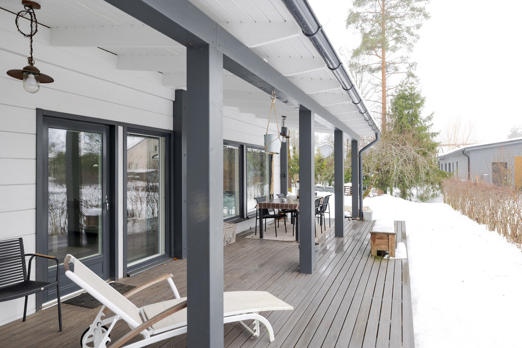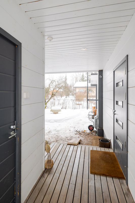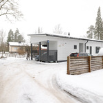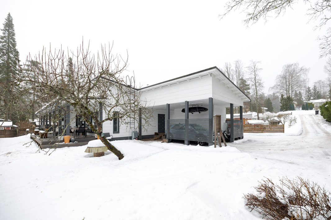 Tässä kodissa yhdistyvät arjen sujuvuus ja estetiikka. Iso avokeittiö-olohuone on monen perheen mieleen ja pienemmät makuuhuoneet aukeavat tähän. Pienten lasten kanssa helppoa elämää, keittiöstä näkee mitä tapahtuu ja lisäksi auton saa oven eteen autokatokseen. Olohuoneesta on käynti isolle katetulle terasille ja saunaosastosta/kodinhoitohuoneesta pääsee myös terassille.